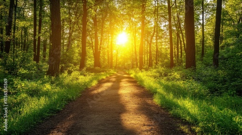 Fototapeta premium A serene forest path illuminated by golden sunlight, inviting exploration and...