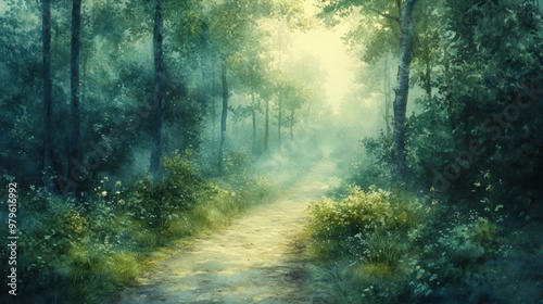 Obraz premium A serene forest path illuminated by soft morning light, surrounded by lush...