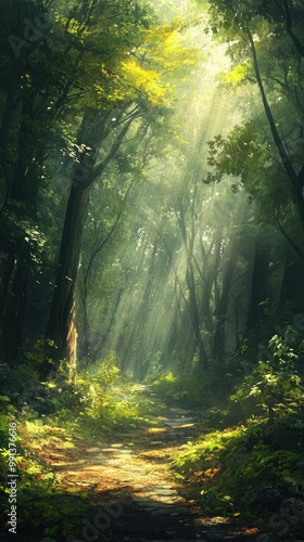 Obraz premium A serene forest path illuminated by soft sunlight breaking through the trees,...