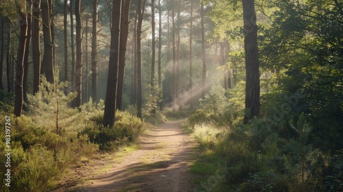 Fototapeta premium A serene forest path illuminated by soft sunlight filtering through tall trees.