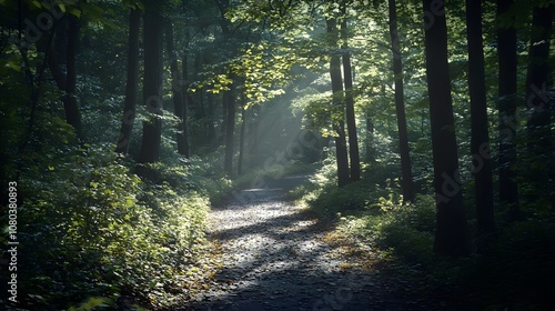 Fototapeta premium A serene forest path illuminated by soft sunlight, inviting exploration and...