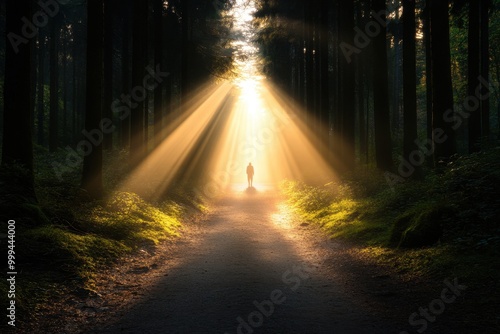 © wpw, Fototapeta premium A serene forest path illuminated by sunlight beams, creating a mystical atmosphere as a figure stands in the distance.
