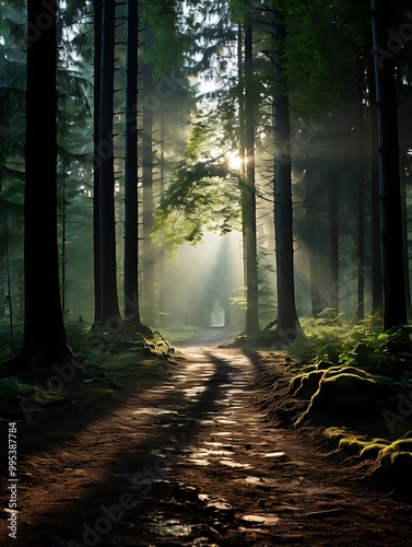 © dea, Obraz premium A serene forest path illuminated by sunlight breaking through the trees.