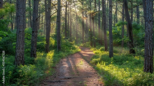 Fototapeta premium A serene forest path illuminated by sunlight filtering through tall trees.