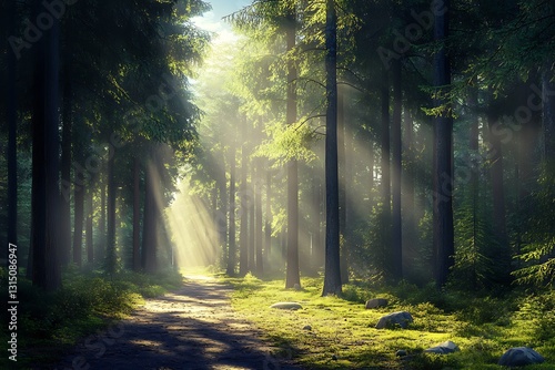 Fototapeta premium A serene forest path illuminated by sunlight filtering through tall trees.