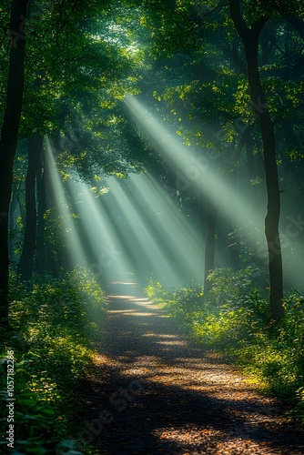 © AgungRikhi, Obraz premium A serene forest path illuminated by sunlight filtering through trees.