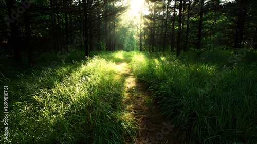 © Pickoloh, Obraz premium A serene forest path illuminated by sunlight filtering through trees, surrounded by lush green grass and foliage