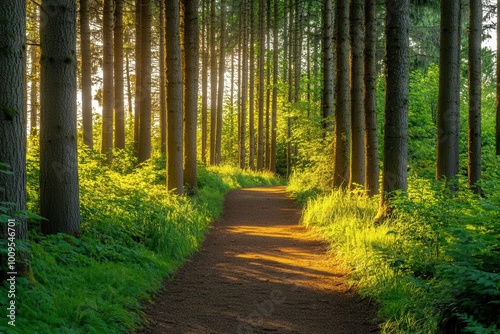 Obraz premium A serene forest path illuminated by sunlight, inviting exploration and...