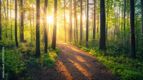 Obraz premium A serene forest path illuminated by sunlight, inviting exploration and...