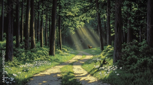 Obraz premium A serene forest path illuminated by sunlight, inviting tranquility and...