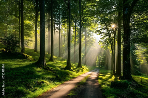 Obraz premium A serene forest path illuminated by sunlight, showcasing lush greenery and...