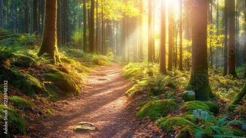 Fototapeta premium A serene forest path illuminated by sunlight, showcasing vibrant greenery and...