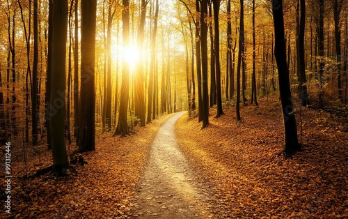 Obraz premium A serene forest path illuminated by sunlight, surrounded by autumn foliage,...