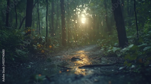 © BerkahStock, Obraz premium A serene forest path illuminated by sunlight through raindrops.