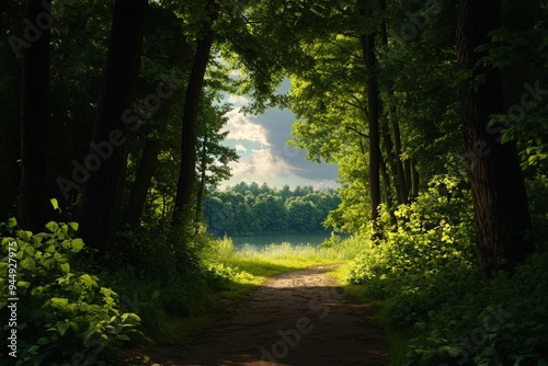 Obraz premium A serene forest path leading through lush greenery, inviting exploration into...
