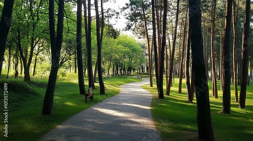 Obraz premium A serene forest path lined with tall trees and vibrant green foliage,...