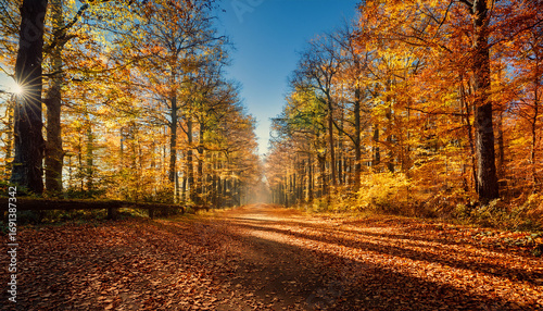 © Seraphina, Obraz premium A Serene Forest Path Lined With Trees And Fallen Leaves Under A Clear Blue Sky