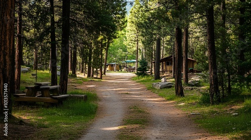 Fototapeta premium A serene forest path lined with trees, leading to a rustic cabin area, bathed...