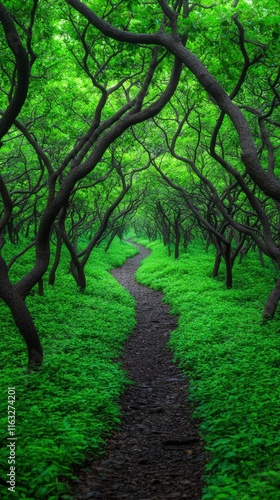 © Morninghead, Naklejka premium A serene forest path meanders through lush greenery, with twisted trees arching overhead, creating a tranquil and inviting atmosphere for exploration and reflection.