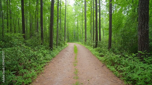 © Nitchalee N., Fototapeta premium A serene forest path splits through lush greenery, inviting exploration and showcasing the beauty of nature.