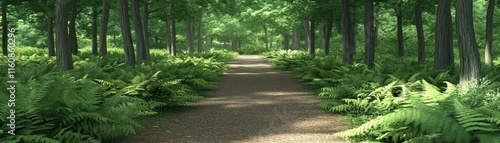 Obraz premium A serene forest path surrounded by lush greenery and ferns.