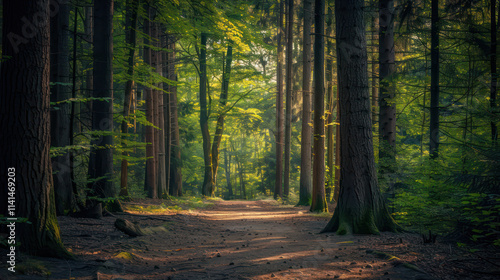 © sticker2you, Obraz premium A serene forest path surrounded by tall trees and lush greenery
