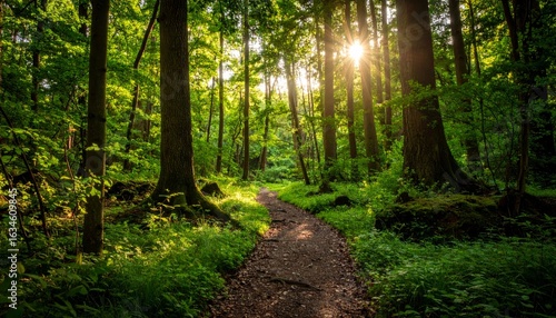 Obraz premium A serene forest path surrounded by tall trees, bathed in warm sunlight,...