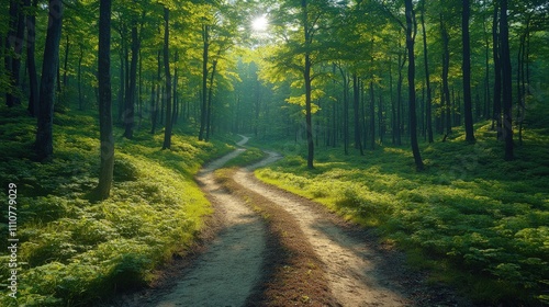 Obraz premium A serene forest path winding through lush greenery, inviting exploration and...
