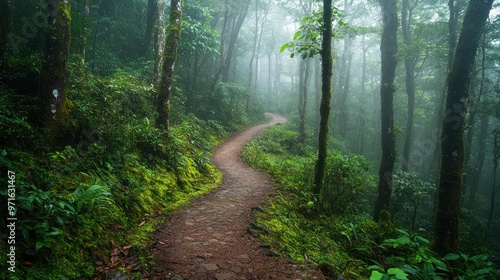 Obraz premium A serene forest path winding through misty trees, inviting exploration and...