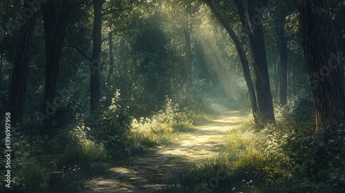 Obraz premium A serene forest path with soft dappled light filtering through tall trees,...