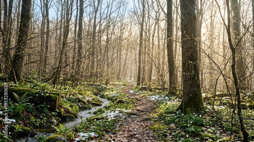 © Dara, Obraz premium A serene forest path with sunlight filtering through the trees, leading to a small stream with snow on the ground.