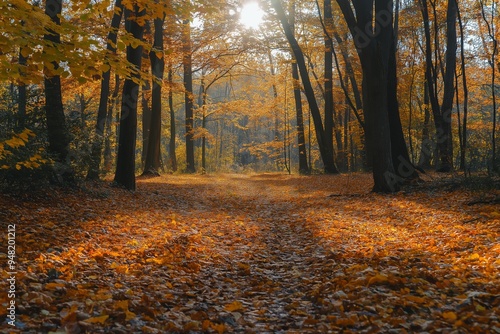 Fototapeta premium A serene forest pathway, covered with fallen autumn leaves and bathed in the...