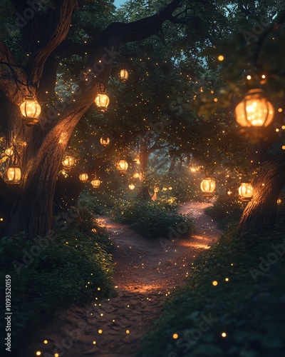 Naklejka premium A serene forest pathway illuminated by glowing lanterns and string lights, creating a magical atmosphere at twilight in a tranquil setting