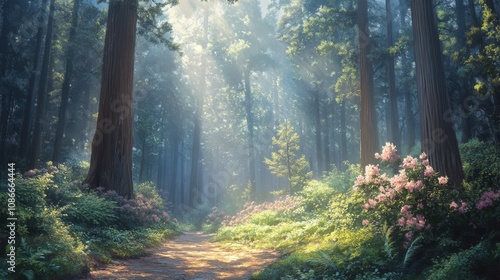 Obraz premium A serene forest pathway illuminated by soft sunlight filtering through tall trees, surrounded by vibrant flowers and lush greenery.