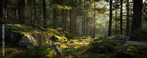 © JT Studio, Obraz premium A serene forest pathway illuminated by soft sunlight, with lush greenery and moss-covered rocks, creating a tranquil and inviting atmosphere.