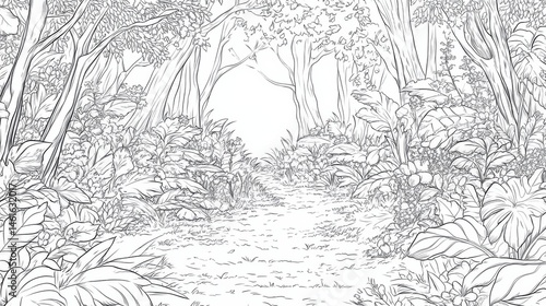 Naklejka premium A serene forest pathway surrounded by lush foliage.