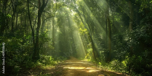 Fototapeta premium A serene forest pathway with rays of sunlight piercing through the dense...