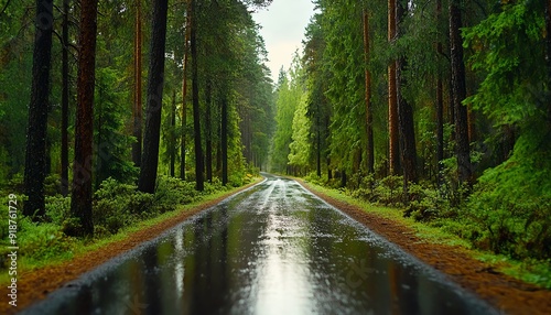 Obraz premium A serene forest road after rain, surrounded by lush green trees, creating a...