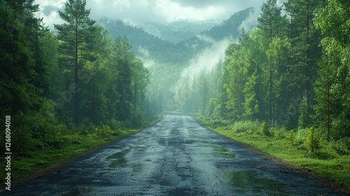 © darion, Obraz premium A serene forest road surrounded by lush greenery and misty mountains.
