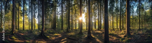 Fototapeta premium A serene forest scene at sunrise with tall trees and lush greenery, creating...