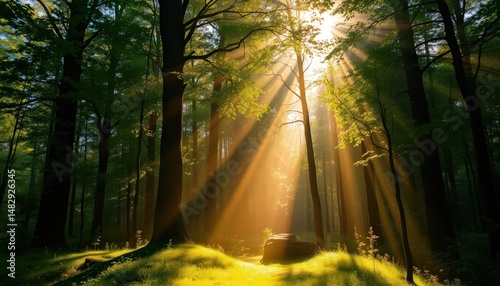 © Kurnia, Naklejka premium A serene forest scene bathed in golden sunlight