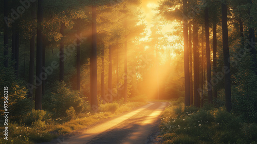 © NaphakStudio, Fototapeta premium A serene forest scene bathed in golden sunlight, with rays filtering through tall trees, creating peaceful atmosphere along winding path.