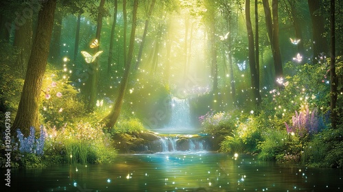 © Jennifer, Obraz premium A Serene Forest Scene Depicting Magical Butterflies and Waterfall