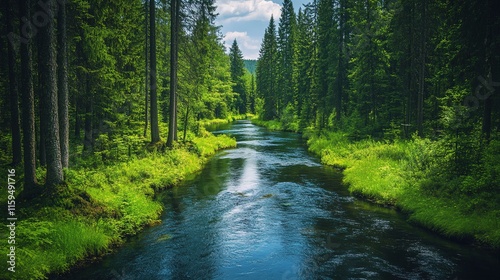 Obraz premium A serene forest scene featuring a clear river flowing through lush greenery,...