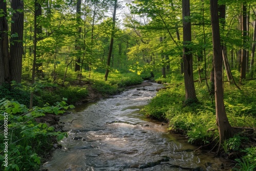 © AbdulHakim, Obraz premium A serene forest scene featuring a flowing stream surrounded by lush greenery.
