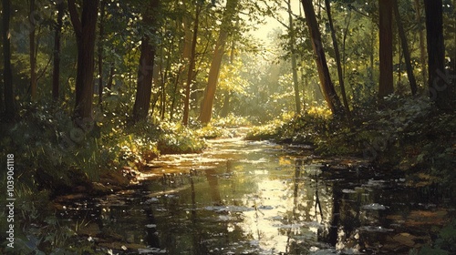 © Ashley, Obraz premium A serene forest scene featuring a narrow, gently flowing creek. Sunlight filters through the tall trees, casting dappled patterns on the water's surface. The lush, green foliage surrounding the water