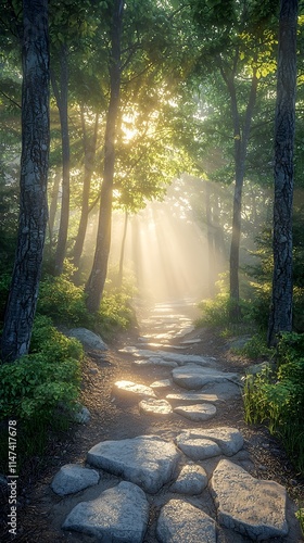 Obraz premium A serene forest scene featuring a sunlit path winding through lush greenery,...