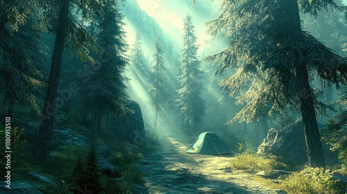 © Trionorejo, Fototapeta premium A serene forest scene featuring a tent, sunlight filtering through tall trees.