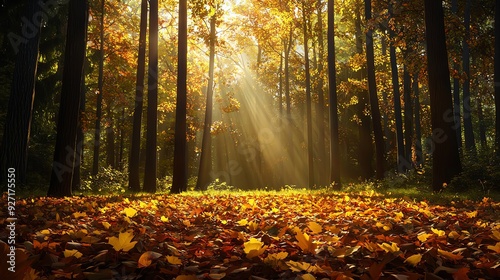 Obraz premium A serene forest scene featuring golden light filtering through vibrant autumn...