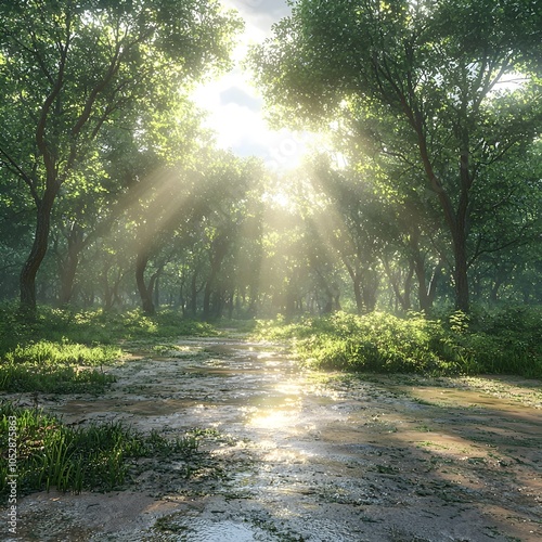 Obraz premium A serene forest scene featuring lush green trees illuminated by soft sunlight filtering through the foliage, creating a magical atmosphere over a tranquil pathway.